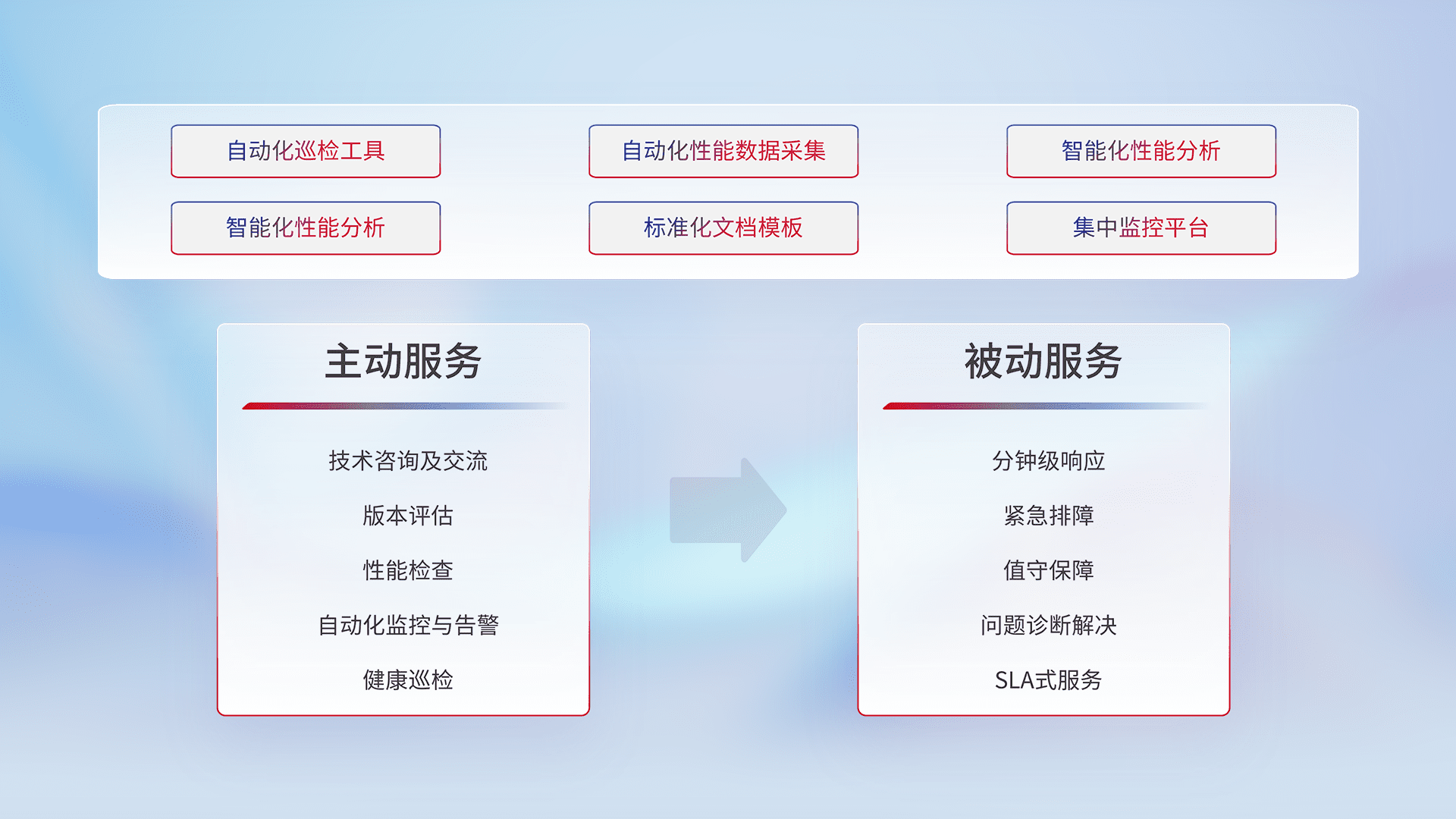 智能化工具和标准化文档,,保障服务质量,,,,提供主动服务(包含技术咨询、、、、版本评估、、性能检查、、、自动化监控与告警、、健康巡检)和被动服务包含(分钟级响应、、紧急排障、、值守保障、、问题诊断解决、、、、SLA服务)。。。